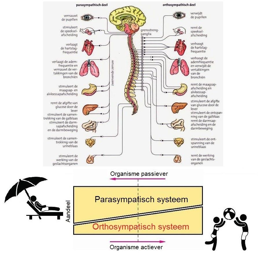 Met je ademhaling kun je dus twee systemen aanspreken; het parasympatische of het (ortho)sympathische. Dit wordt gelinkt aan het 'Window of Tolerance' gebruikt binnen de psychologie bij stresshantering. In onderstaande foto zie je wat beide systemen zoal doen in ons lichaam. Je kunt je voorstellen dat we voor een gezonde balans tussen beiden moet bewegen.